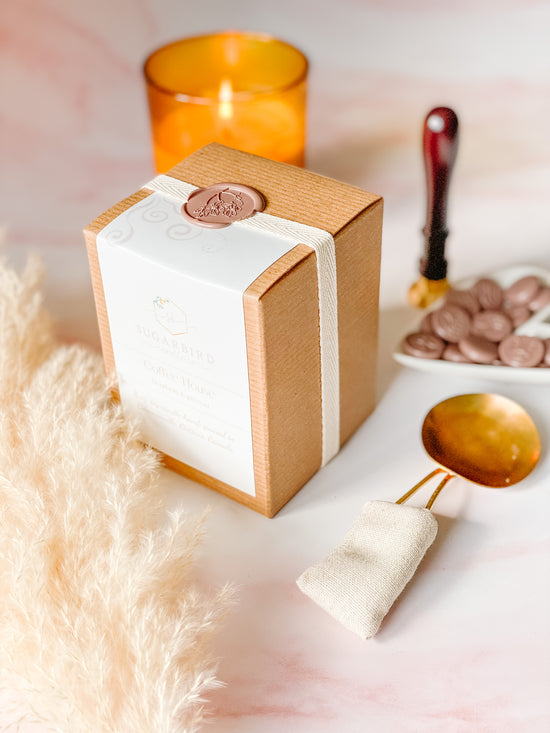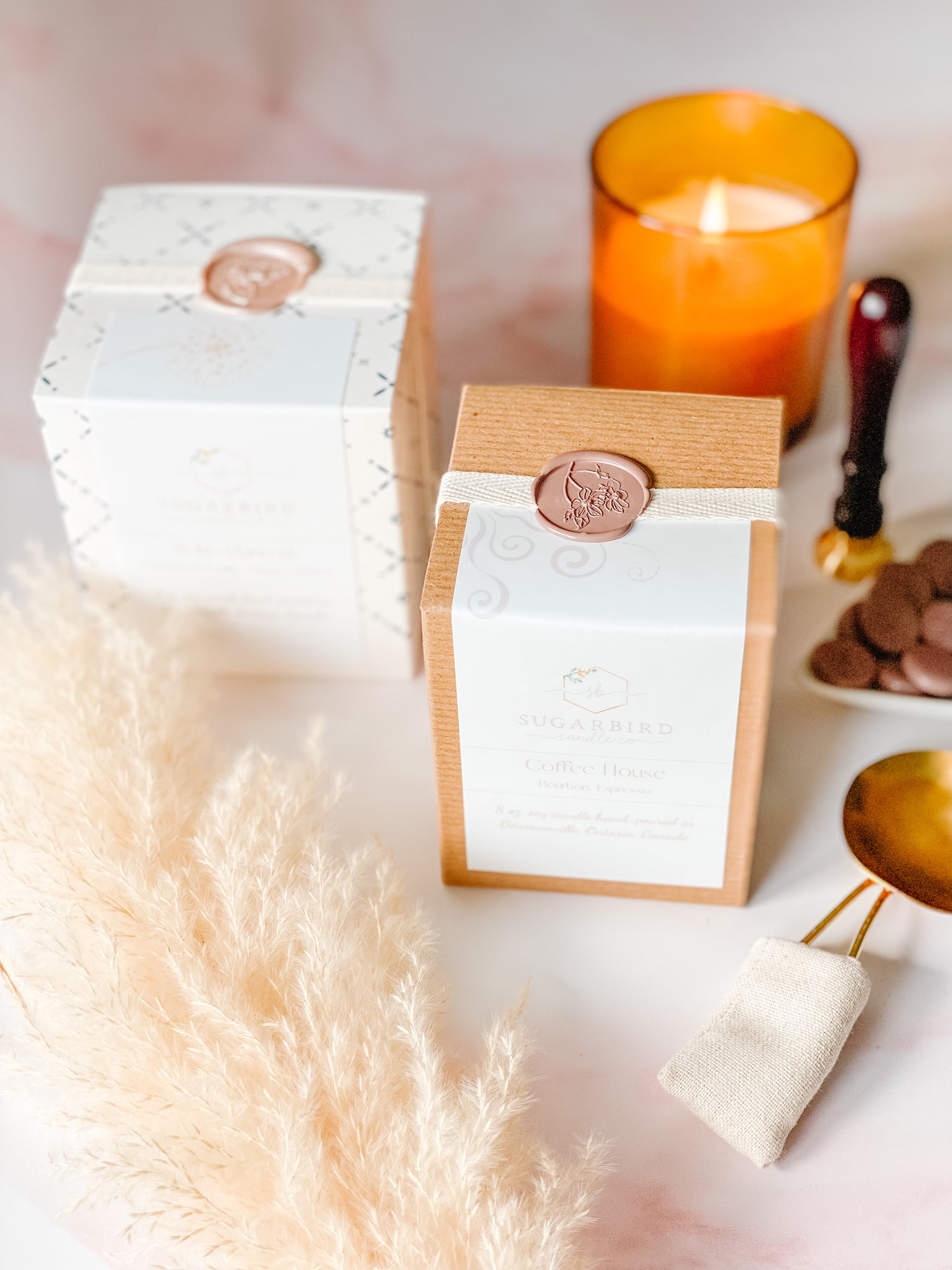 All of our candles come packed in luxury packaging including kraft boxes (8 oz. candles) or cotton drawstring bags (13 oz. candles)